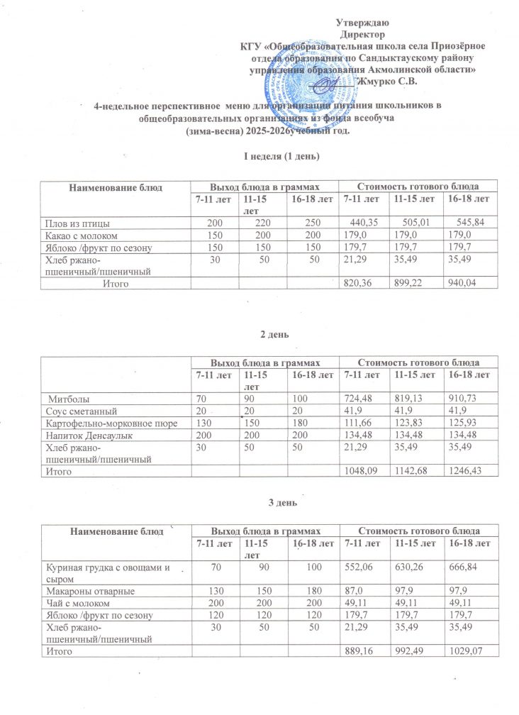Жалпы білім беру ұйымдарында оқушылардың тамақтануын ұйымдастыруға арналған перспективалық мәзір 2025-2026 оқу жылы